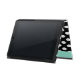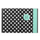 Stylish iPad Air folio style case with built in stand done in a black and white polka dot. A mint green band, running down the right front edge and a decorative mint green disc, on the middle front, has a black one letter monogram ready to personalize. Makes a great personalized gift idea.