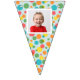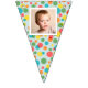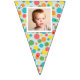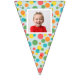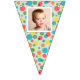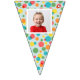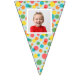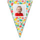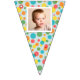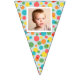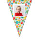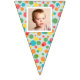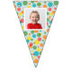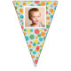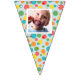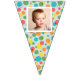 Add a special touch to any celebration with this custom bunting garland. It's ready to be customized with up to 16 of your photos--1 photo on each flag. The photos are set inside of a white frame against a background of colourful polka dots on light blue.