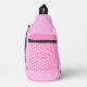 Modern girls bright pink polka dot and name cross body bag. Personalize with your own name and initial. This example reads: Monica T.  Design by Sarah Trett for www.mylittleeden.com