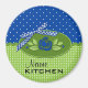 Polka Dot Roses Refrigerator Magnet, Blue-is a graphic art design. The top portion of the background is blue and white polka dots. The bottom half is green and white polka dots. A thin green ricrac ribbon divides the two patterns. In the centre is a green oval shape holding a blue rose with green leaves. A chequered blue and white bow embellishes the oval. I have placed two text areas on the magnet for you to personalize. Replace the word NAME with a person's name. The second word says Kitchen. Both text areas can be edited or deleted if you prefer. This polka dot roses design is available in several assorted colours.