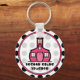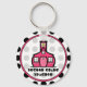 A keychain featuring a black and white polka dot background. Logo of Pink Schoolhouse inside a hot pink frame. Customizable text reads "Second Grade Teacher"