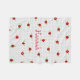 Sweet blue baby fleece blanket, with a tiny black on white polka dot pattern and cute red, black, and green flowers. Personalize the red text. Lovely baby gift idea.