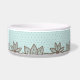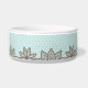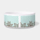 White ceramic dog food / water bowl, with graphics of a brown small polka dot pattern on a robin's egg blue background. Graphics of a brown Lacey design runs along the bottom of the bowel. Personalize the brown text for your pet or as a great gift idea for any pet owner.