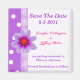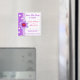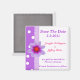 Whimsical Spring inspired graphics, in tones of purple, white, and pink. A pretty lavender flower sits on a gingham ribbon with a polka dot background, on the left side of the magnet. Personalize this great Save the date magnet with your names and information. The perfect marriage announcement for a Spring or Summer wedding.