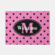 Pink background with black polka dots. In the centre is a black oval badge and two templates,one to add an initial and one to add a name.