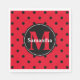 Classic, timeless, Retro pattern of black polka dots on a red background.. In the centre is a black round badge framed with white dots. Inside the circle are two templates, one in red lettering to add your initial and the other in white lettering to add your name.