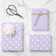 This soft lavender wrapping paper set includes three coordinated sheets: two sheets adorned with crisp white polka dots and one sheet in a solid soft lavender for a delicate, elegant contrast.