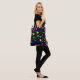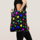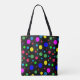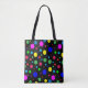 This cheerful tote bag features circles in a riot of colourful balloon polka dot bubbles: yellow, green, turquoise, blue, red, orange and pink. All are set on a black background.