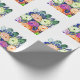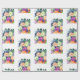 Decorated paper that is used to cover presents. Rosas orange, green and perpule with green leaves.