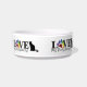 This is a heavy, durable bowl decorated with Tibbies of many colors, the perfect size for hungry/thirsty Tibs. The design is interesting and printing clear.