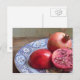 The design features a photograph that I took of a still life. The still life has three pomegranates and a blue and white patterned plate. The plate sits on an old wooden table, with a beautiful blue gauzy background.