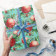 Colourful pomegranate fruits with green leaves on a light teal background.