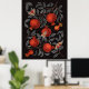 Pomegranate branches with lush leaves and rich red fruits stretch across a black background. A secondary layer subtly fades away, adding depth. Traditionally painted on paper with markers, the elements are scanned and composed into a pattern in Photoshop.