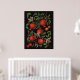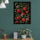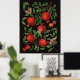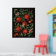 Pomegranate branches with lush leaves and rich red fruits stretch across a black background. A secondary layer subtly fades away, adding depth. Traditionally painted on paper with markers, the elements are scanned and composed into a pattern in Photoshop.