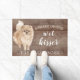Funny beware of the wet kisser" Pomeranian Dog door mat set on a rustic faux background. Visit our shop to view a large assortment of dog breads