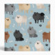 Cute Pomeranian dogs in black, grey, cream, chocolate and red coats sit and stand with scattered dog bones and paw prints on a light blue background.