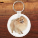 This fun canine keychain features an image of a happy Pomeranian pup highlighted against a creamy white background.