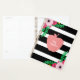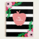 Un planificateur d'enseignant avec l'illustration d'une pomme rose sur un arrière - plan rayé noir et blanc. motifs floraux en haut à gauche et en bas à droite. Personnalisez avec votre nom sur le devant.