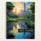 This planner features a vibrant illustration of a pond in a city park. Lily pads float on the blue water and pink flowers bloom along the water's edge. Tall green trees and grasses add to the park setting. In the distance, tall buildings reach toward the sky, which is aglow with sunlight. The design is the same on the front and back covers. Personalize the front with the current year.