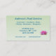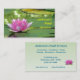 This business card advertises a pond service company which does pond planning, design, construction, maintenance, cleaning and management. It features a lovely pink water lily resting on lily pads. Luminous water reflections glow between the pads of this well-constructed pond. All text can be customized to suit your individual situation.
