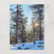 The sun shines through Ponderosa Pines as it begins to set behind the mountains on a February evening.