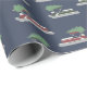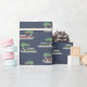 This patterned wrapping paper is perfect for Christmas. The gift wrap features illustrations of pontoon boots with a Christmas tree on top set against a navy blue background.