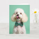 This card shows a close-up, nearly head-on view of a fluffy white poodle-type dog that fills the frame with an inviting presence. Its ivory fur looks freshly groomed against a soft mint-green background, and the gentle contrast makes the face feel extra close, like it’s leaning in to say hello. Dark brown eyes hold a tender, attentive look that feels like loyal friendship, while a little pink tongue peeks out in a sweet, teasing way 💚. A forest-green plaid bow tie sits neatly at the neck, adding a dressed-up touch that suggests it’s ready for a St. Patrick’s Day date or a cozy get-together ☘️. Bright, even lighting adds soft shadows in the curls without pulling attention away from the dog’s expression. Along the top, “Happy St. Patrick’s Day” appears in medium-green lettering, centered and easy to read against the mint background. The mint backdrop stays smooth and uncluttered, making the green bow tie and the dog’s dark eyes stand out.
