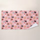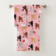 Cute Valentine's Day Poodles with in black, white, gray, apricot and brown color coats wearing red, pink, and white polka dot and heart sweaters with scattered paw prints and arrow on a pink background.