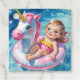 A cute young girl gently drifts on a pink and white unicorn float, gliding across a crystal-clear, blue swimming pool.