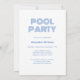 Pool party birthday invitation with a cute illustration of a little whale. The whale is wearing a red and white striped party hat and has started the birthday party which takes place in a filled water glass.