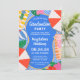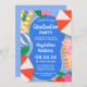 Colourful, modern and trendy high school graduation party invitation. The party details are written on the blue water of the pool in white text. The aerial view shows women sunbathing poolside, red and white umbrella tops, beach balls, and tropical flowers and palm leaves. Blue and white tile provides the background. This item is part of the Graduation Pool Party collection.