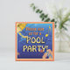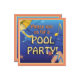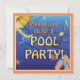 A graphic illustration of beach umbrellas, summer lounge chairs, flip flops and music notes on a Pool Party invitation. The invitation has text templates for your personalization. ©2013charmainepaulson