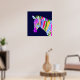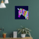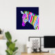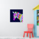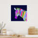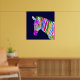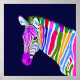 A digital art illustration of a zebra head, set against a dark blue background. The zebra is depicted with vibrant, non-traditional colors, its stripes rendered in shades of pink, purple, green, blue, and orange. The mane is a mix of red, yellow, and green. The style is flat and graphic, with no shading or texture, giving it a modern, pop art feel. The composition is a close-up of the zebra's head, angled slightly to the left, filling most of the frame.