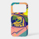 This is a vibrant digital illustration in a pop art style featuring an astronaut driving a futuristic, rocket-powered car. The astronaut, wearing a yellow and white spacesuit with a green visor, is at the wheel of a pink and yellow car with large rocket boosters attached to the rear. Flames and smoke in shades of orange and yellow erupt from the rockets. The background is a teal color with a pattern of orange dots in the upper left and swirling peach and orange shapes. The artwork has a retro science fiction aesthetic with bold colors, thick outlines, and a dynamic sense of speed and adventure.