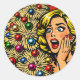 Pop Art Christmas, shocked expression, funky tree Classic Round Sticker. A retro bright POP of color for a humorous sticker of fun for your outgoing mail and Christmas Cards. The woman is shocked it's Christmas already or perhaps she's amazed that she got her Christmas cards in the mail. A fun and easy way to add a little bit of extra personality to your envelopes, gift wrappings and more. Use this for your office parties or Secret Santa gifts, too!
