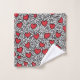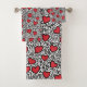 This vibrant pattern features bold, red hearts scattered across a white background filled with dynamic black doodles. The playful design, reminiscent of pop art, uses strong lines and whimsical shapes to create a lively and energetic visual. The juxtaposition of bright red hearts and abstract black strokes evokes a sense of love and spontaneity.