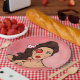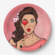Fun pop art design with a woman holding a heart-shaped lollipop over one eye.