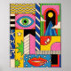 This image is a vibrant and eclectic abstract collage, reminiscent of pop art and psychedelic styles. It's composed of various rectangular and square panels, each featuring distinct patterns, symbols, or imagery. Elements include a large eye with a green iris, a bold red lip against a blue polka-dot background, wavy yellow stripes, black and white geometric patterns, and abstract architectural shapes like pyramids and arches. The colour palette is bright and contrasting, with pink, yellow, blue, red, and black dominating. The overall effect is energetic, playful, and visually stimulating, suggesting a blend of retro and contemporary aesthetics.