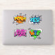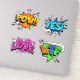 A collection of four vibrant comic book-style speech bubbles and action bursts. The set features "POW!!", "YES!", "LOVE", and "WTF" in bold, 3D block lettering with halftone patterns, Ben-Day dots, and jagged "explosive" frames.