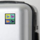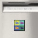 A picture of a squirrel photomanipulated in a pop art style in blue, green, yellow, orange, turquoise, and purple against a black background on a magnet