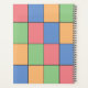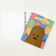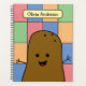 Fun colourful pop art style journal with a check pattern of different coloured rectangles on the front and the back of the planner. The front at the top is a template to add your name or other text to personalize. Below the template is a happy brown cartoon potato with little dots for eyes, stick arms sticking out of either side of his body and a big happy smile.