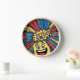 Eye-catching pop art wall clock with bright comic-style shapes in red, yellow, and blue. A fun and modern statement piece