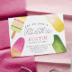 Adorable party invitations for your little one's summer birthday party feature four watercolor popsicle illustrations in vibrant shades of pink and lime green, with "pop on over and chill with us" in whimsical script lettering. Personalize with your birthday party details beneath.