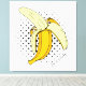 Funky modern wall art print of a peeled yellow banana fruit over black half tone dots. There's customisable text underneath for you to add names or a quote