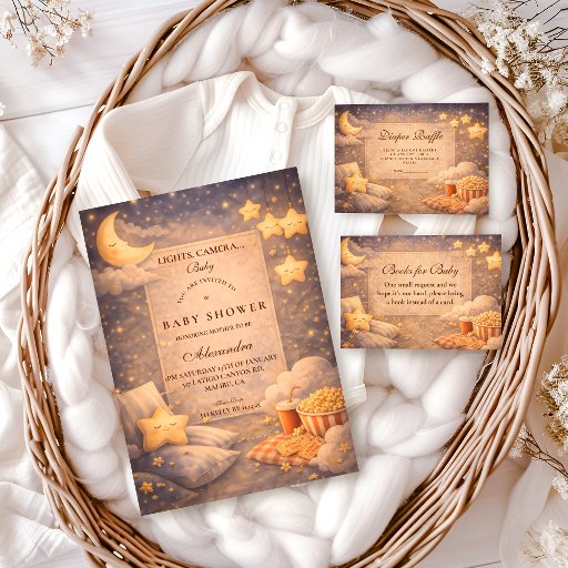 Set the scene for a cozy, cinematic celebration with this movie-themed baby shower design. Inspired by a warm home-theatre night, the artwork features glowing string lights, classic popcorn tubs, soft blankets, and a nostalgic film-screen centerpiece that instantly creates a relaxed, intimate atmosphere.