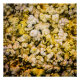 Macro view of hot popcorn grains or kernels behind the wet glass. Textured photography. Do not miss the opportunity to look at funny T-shirt I'M FINE which depicts a stomach full of popcorn.