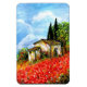 Tuscany landscape,colourful ,vibrant ,expressive beauty of Italian countryside and red poppy fields ,beautiful Summer flora in bright green,yellow ,brown,blue ,white colours,meadows,flower field,cypress and olive trees,rustic old farm house under the blue sky and white clouds .Acrylic painting on canvas .