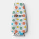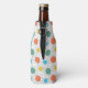 This bottle cooler has a mid-century modern design of circles with lines behind in orange, yellow, turquoise, and green.