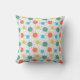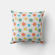 This throw pillow has a mid-century modern design of circles with lines behind in orange, yellow, turquoise, and green.