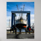 This boatyard photography poster shows a vessel being hauled out of the water by marine travelift with its shipmates standing watching intently for maintenance at the historic Port of Port Townsend Boat Haven facility. Whether for maritime lovers, local enthusiasts, or art collectors, this easy to frame poster celebrates the heritage and vibrancy of Port Townsend, Washington, making it a perfect addition to any collection or display space.